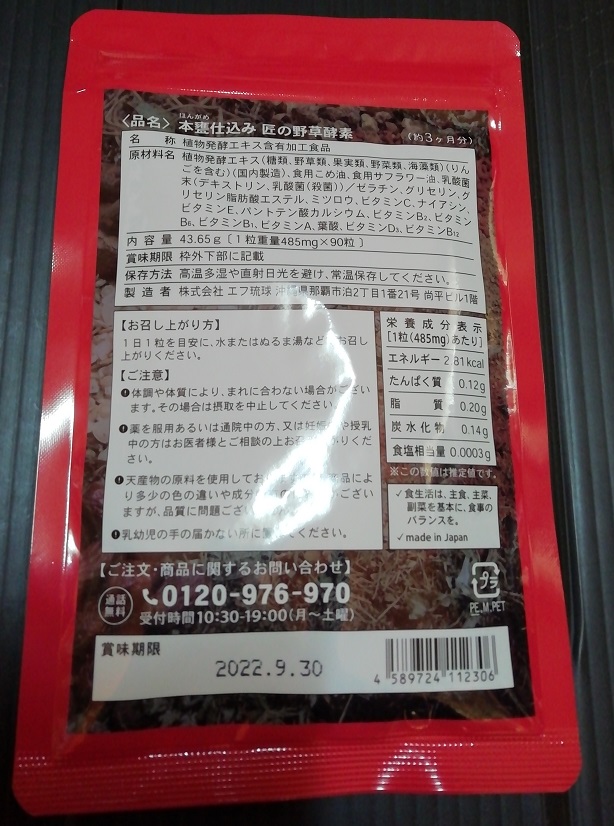 前に購入したサプリメントのショップで、またクーポンで安価だったので購入してみた匠の野草酵素。自分用というより親用に三ヶ月分のを。
